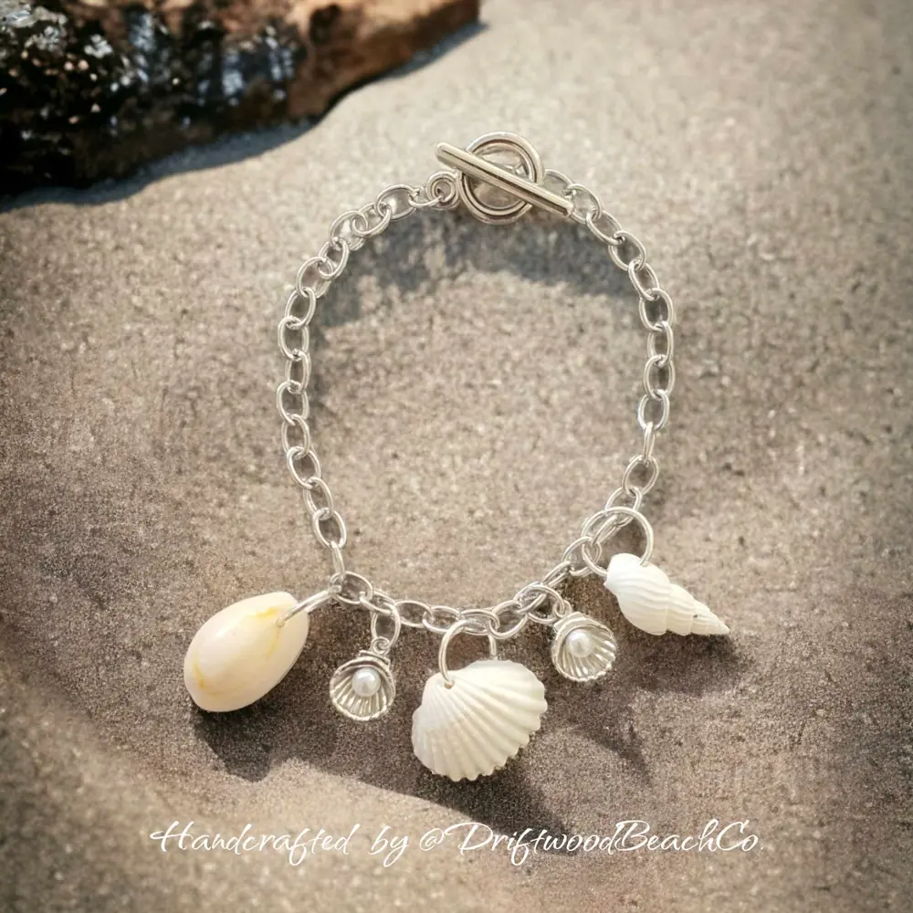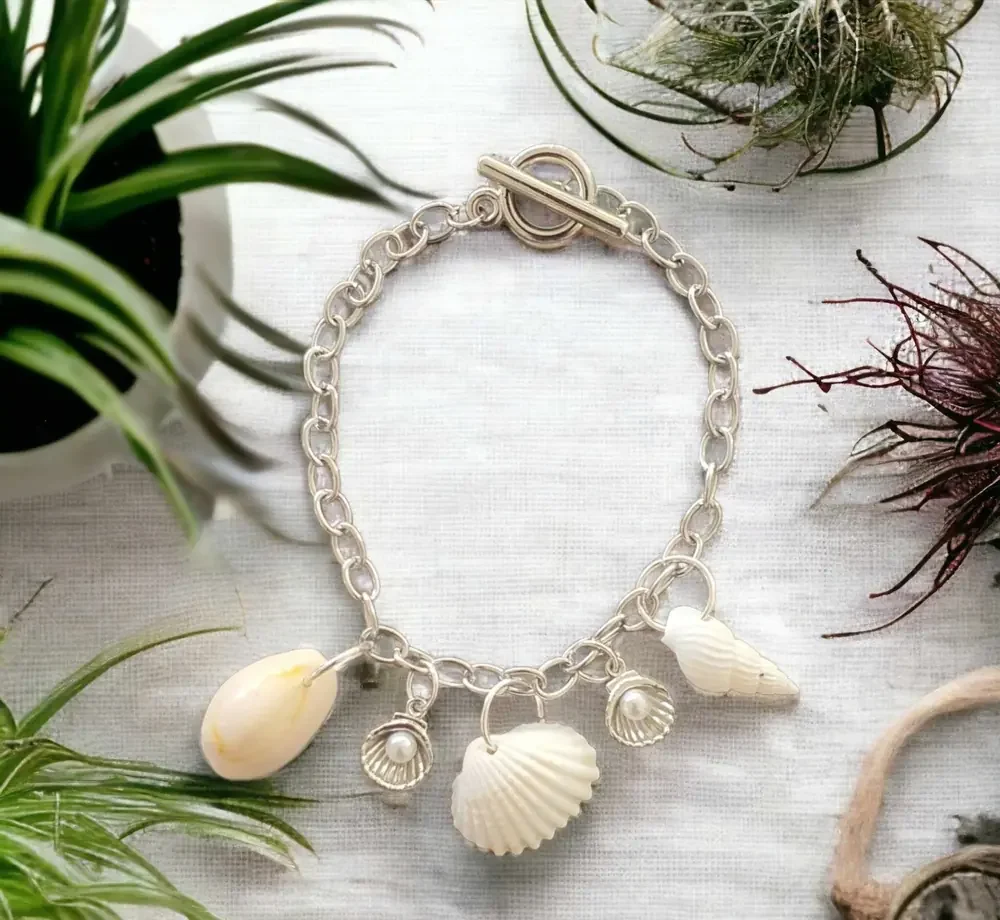 T Bar Shell Bracelet is the perfect accessory to complete your bridal look for your beach-themed wedding. Made with real seashell charms and Tibetan silver scallop shells with faux pearls, this bracelet will add a touch of elegance to your special day.