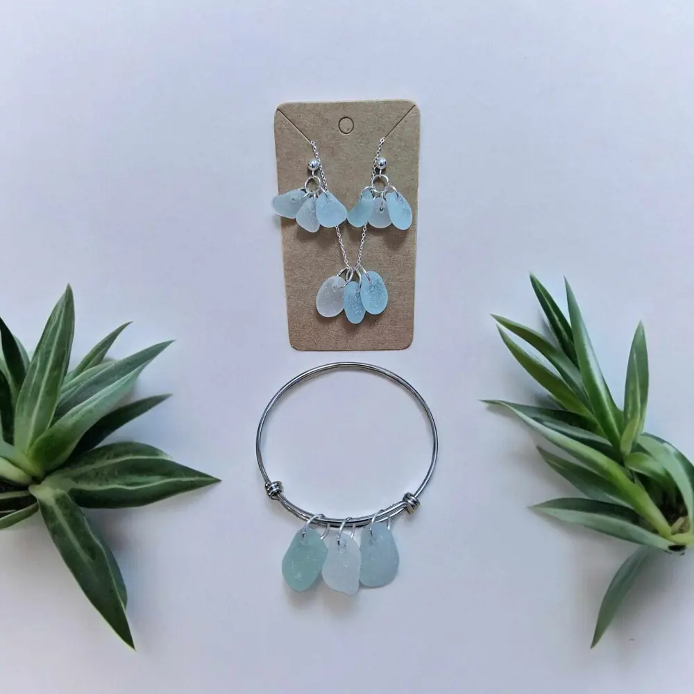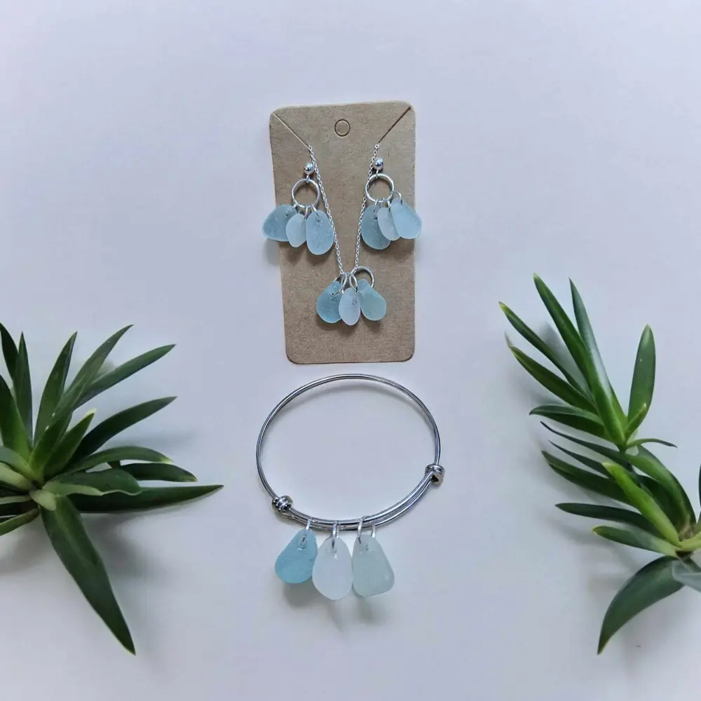 The set includes a matching necklace, earrings and bangle, offering a complete ensemble to adorn your style. Enhanced with an 18″ adjustable 925 Silver chain, this set exudes elegance and sophistication, perfect for any occasion. Silver butterfly back earrings and an adjustable stainless steel bangle. Discover the allure of the ocean with our handcrafted Seaglass treasures.