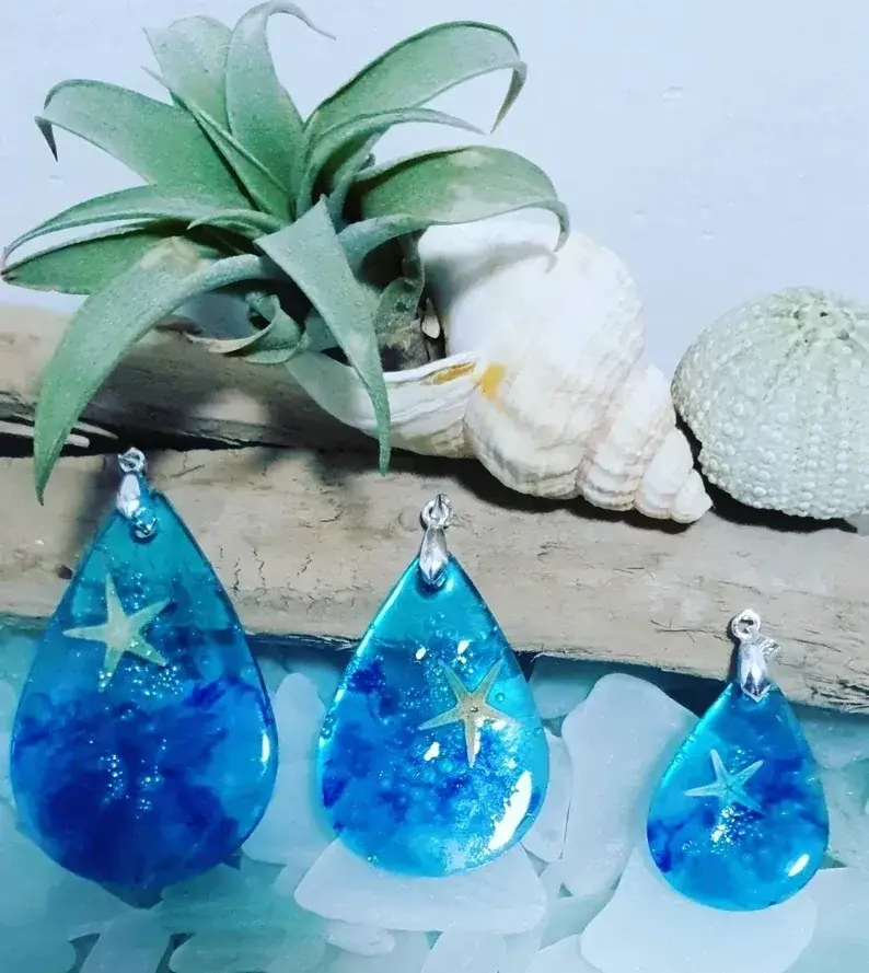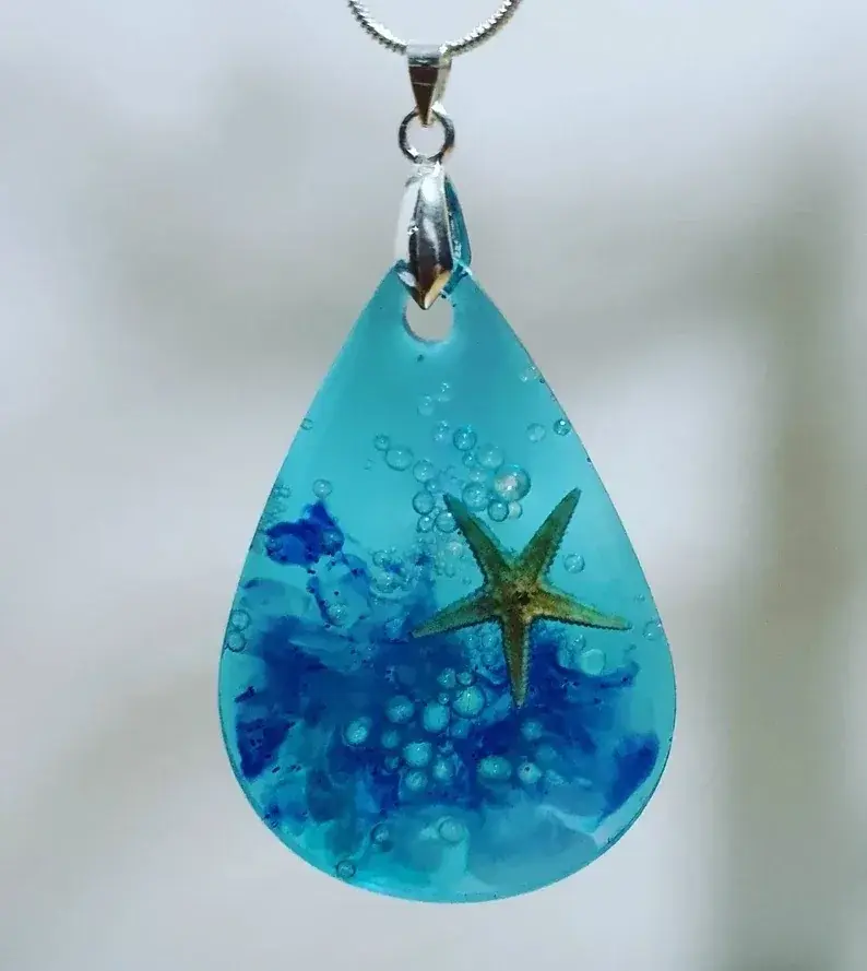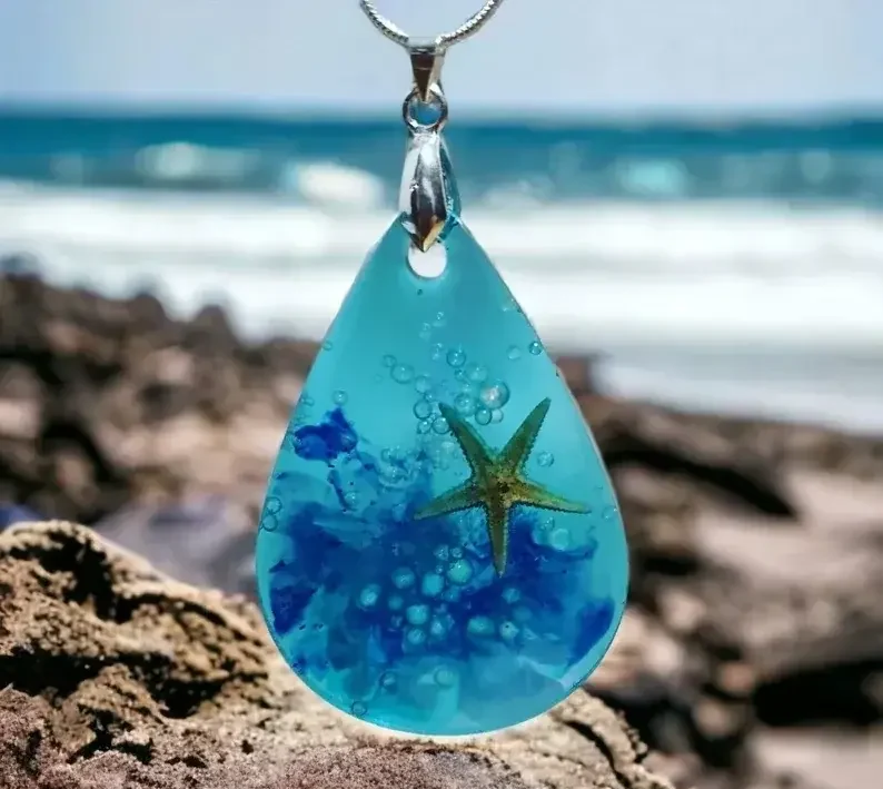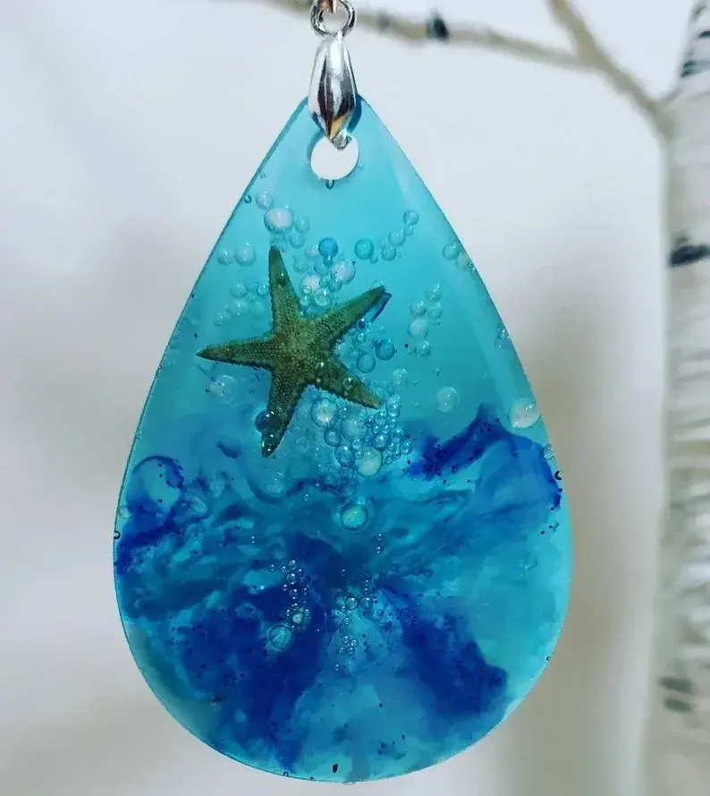Handcrafted with love by Driftwoodbeachco, this stunning pendant captures the essence of the sea with its vibrant shades of blue, glittering pearlescent bubbles, and a real starfish delicately encapsulated within.