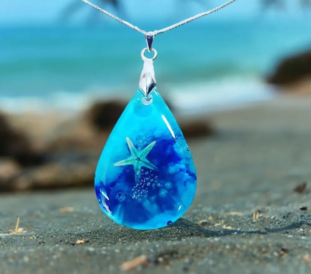 Dive into the depths of ocean style with our exquisite Tropical Resin Waterdrop Necklace. Handcrafted with love by Driftwoodbeachco, this stunning pendant captures the essence of the sea with its vibrant shades of blue, glittering pearlescent bubbles, and a real starfish delicately encapsulated within…