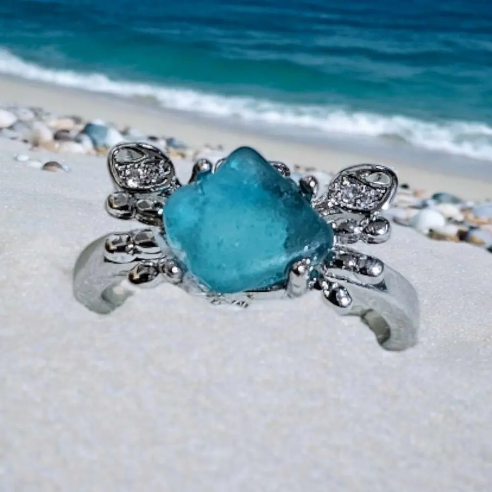 Capture the essence of the ocean with this stunning Handcrafted Fully Adjustable Seaglass Crab Ring. Featuring a beautiful piece of sustainable, beachcombed seaglass in Turquoise, this dress ring is a true statement piece inspired by the natural beauty of the Kent Coast.